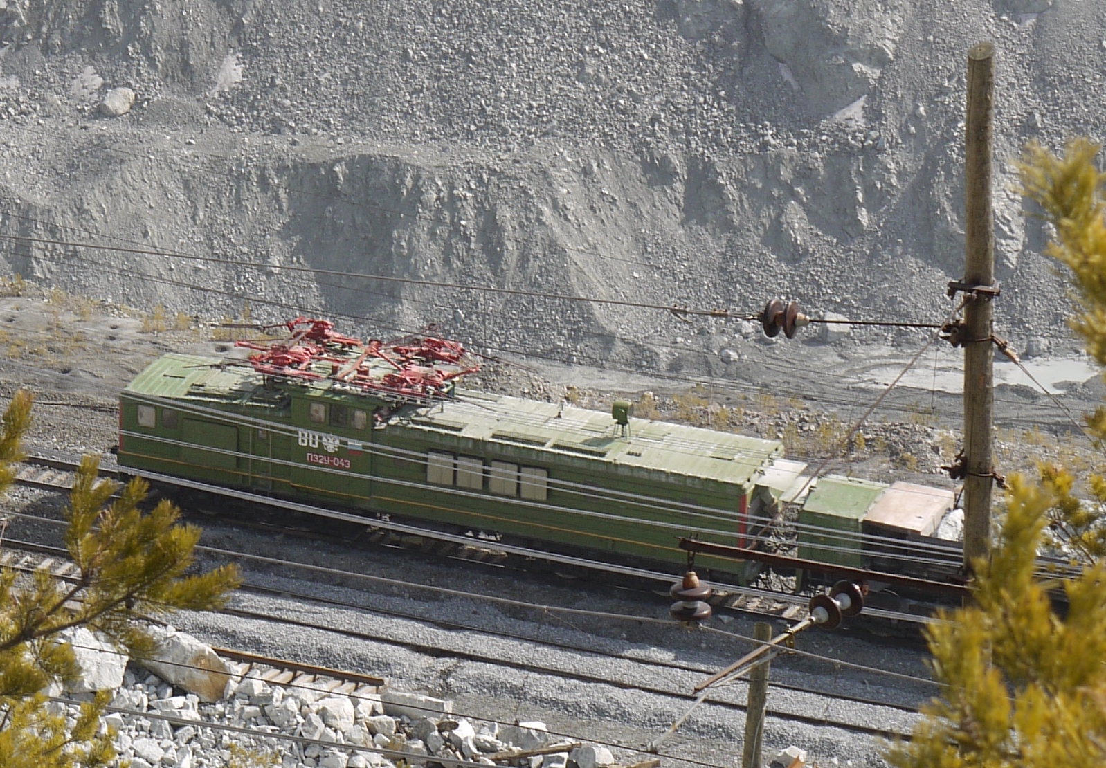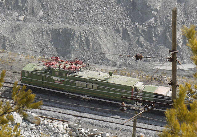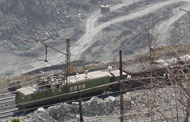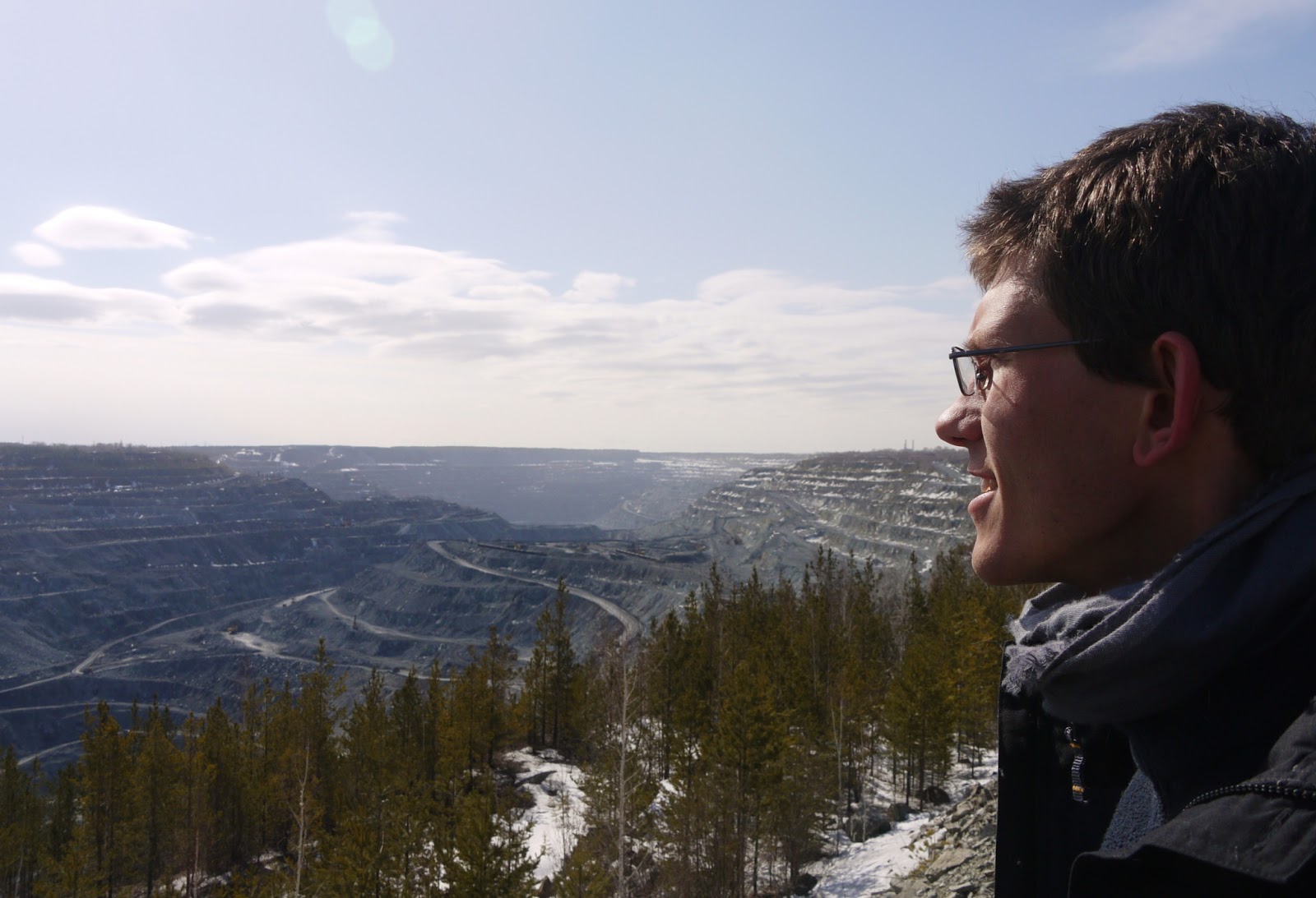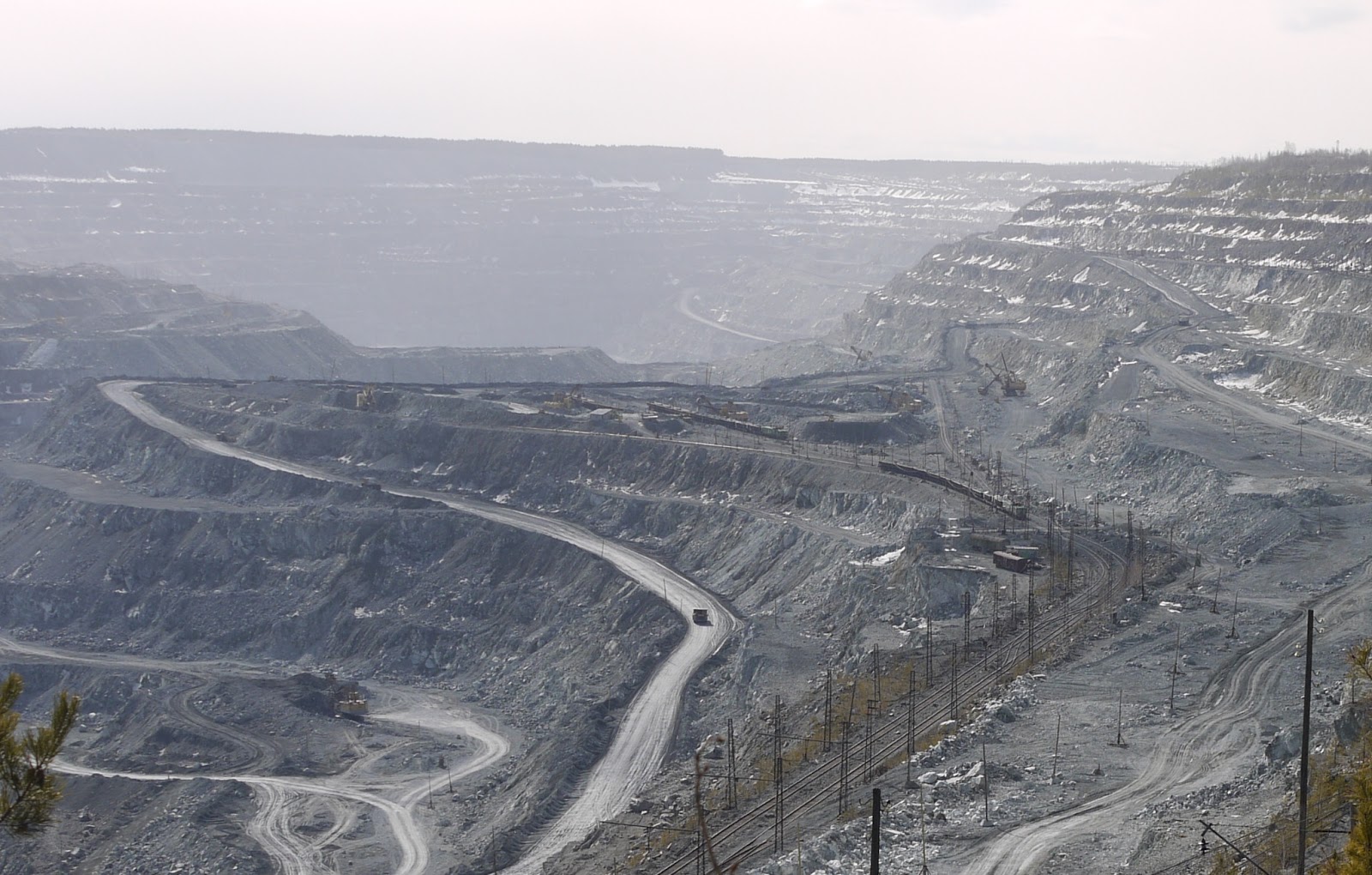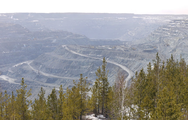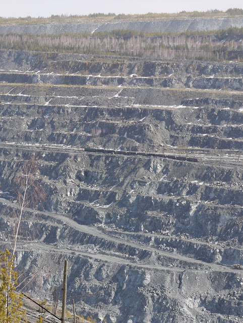 The pit's size was quite impressive. I climbed down through some pine forests along the fringe, to get a better view at the excavators and trains in use to get the stuff out of the pit.